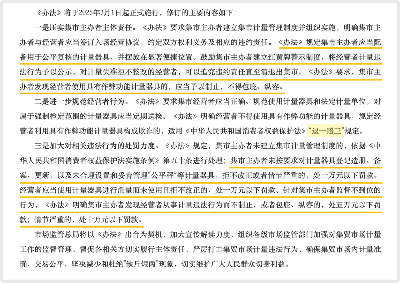 ○ 2025年3月1日:新版《集貿(mào)市場計量監(jiān)督管理辦法》施行。其中核心變化之一是全面壓實了市場主辦方的管理主體責(zé)任。要求其建立計量管理制度、對場內(nèi)秤具登記備案,并有責(zé)任制止并不得包庇計量作弊行為,否則將面臨高額罰款。這些規(guī)定從市場管理源頭建立了防線,促使市場主動加強對合規(guī)電子計價秤的監(jiān)督與采用。